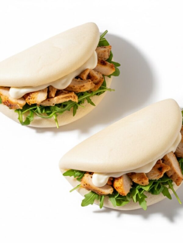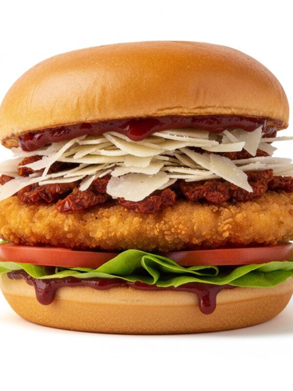 Bun al latte • Pollo • Crema di pomodorini secchi • Scaglie di Grana • Insalata • Salsa segreta