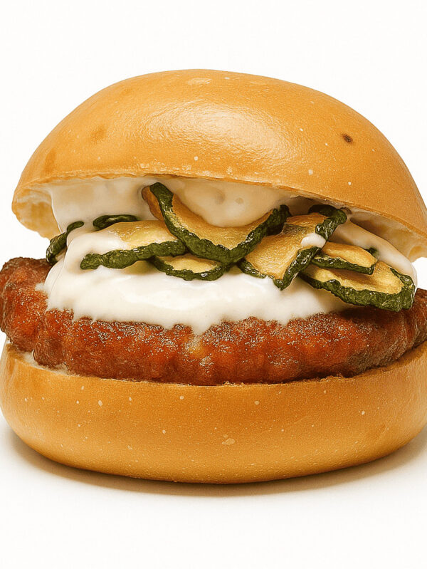 Bun al latte • Pollo • Crema di pomodorini secchi • Scaglie di Grana • Insalata • Salsa segreta